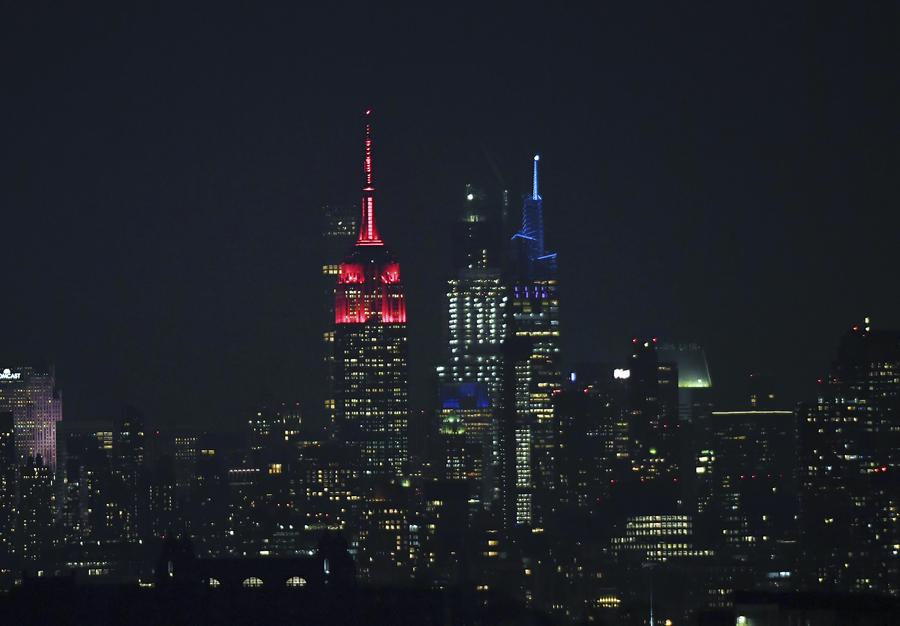 This photo taken on Feb. 8, 2024 shows the Empire State Building lit up in red for the Spring Festival in New York, the United States. (Xinhua/Li Rui)