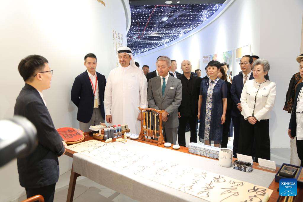 Guests visit a cultural exchange exhibition at the China Pavilion of Dubai Expo City in Dubai, the United Arab Emirates (UAE), Dec. 6, 2024. The inauguration ceremony of the China-UAE Economy and Trade Exchange Center was held on Friday at the China Pavilion of Dubai Expo City. (Xinhua/Wen Xinnian)