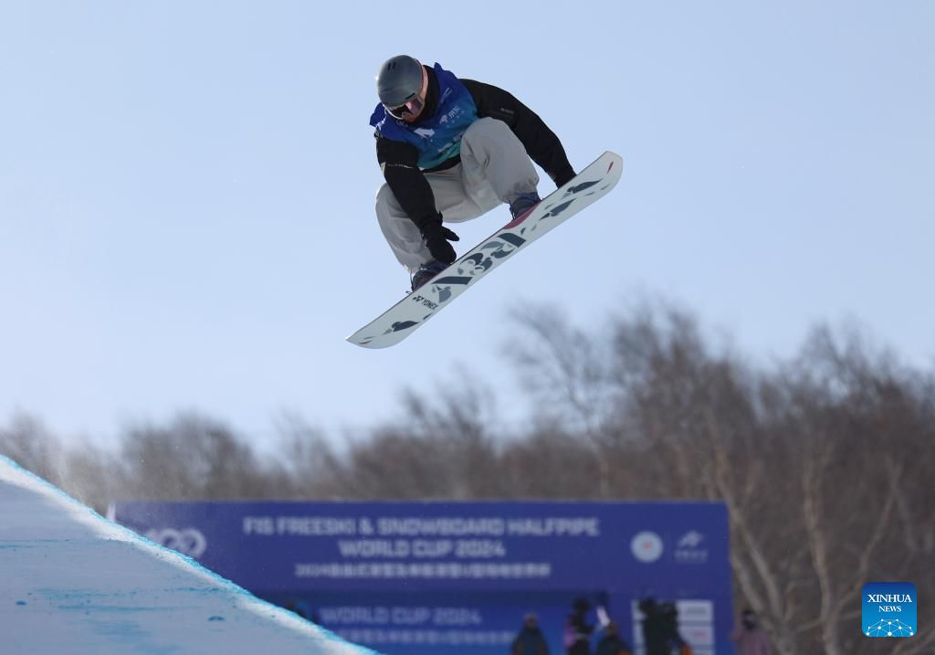 Totsuka Yuto of Japan competes during the men's qualification of FIS Snowboard Halfpipe World Cup 2024 in Zhangjiakou, north China's Hebei Province, Dec. 6, 2024. (Xinhua/Luo Yuan)