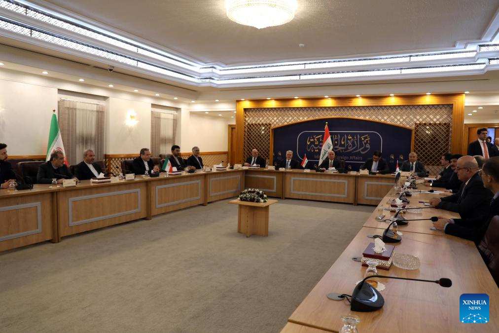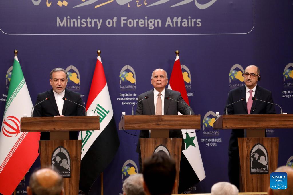 Iraqi Foreign Minister Fuad Hussein, Iranian Foreign Minister Seyed Abbas Araghchi and Syrian Minister of Foreign Affairs and Expatriates Bassam Sabbagh attend a trilateral meeting in Baghdad, Iraq, on Dec. 6, 2024. On Friday, Iraqi Foreign Minister Fuad Hussein held the trilateral meeting with Araghchi and Sabbagh to discuss the deteriorating situation in Syria and its consequences on neighboring countries. (Xinhua/Khalil Dawood)
