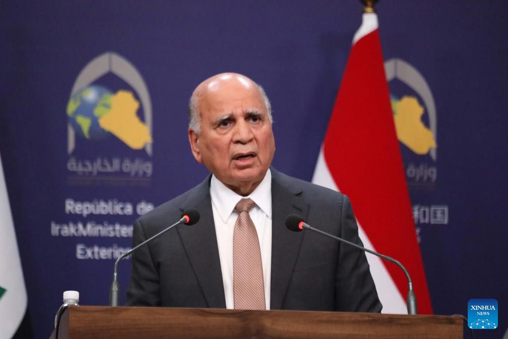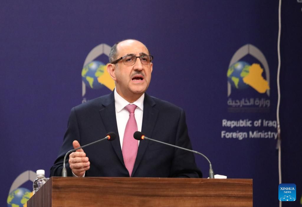 Iraqi Foreign Minister Fuad Hussein speaks at a joint press conference with Iranian Foreign Minister Seyed Abbas Araghchi and Syrian Minister of Foreign Affairs and Expatriates Bassam Sabbagh (not in the picture) after a trilateral meeting in Baghdad, Iraq, on Dec. 6, 2024. On Friday, Iraqi Foreign Minister Fuad Hussein held a trilateral meeting with Araghchi and Sabbagh to discuss the deteriorating situation in Syria and its consequences on neighboring countries. (Xinhua/Khalil Dawood)
