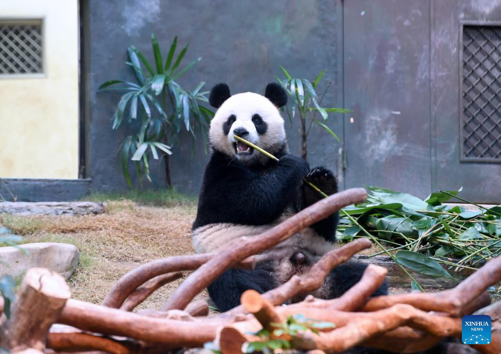 A giant panda eats bamboo at Ocean Park Hong Kong in Hong Kong, south China, Dec. 8, 2024. Giant pandas "An An" and "Ke Ke" gifted by the central government to the Hong Kong Special Administrative Region (HKSAR) made their public debut at Ocean Park Hong Kong on Sunday. (Xinhua/Chen Duo)