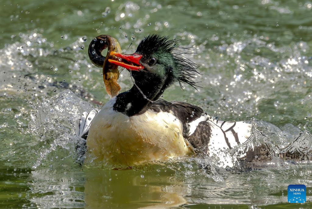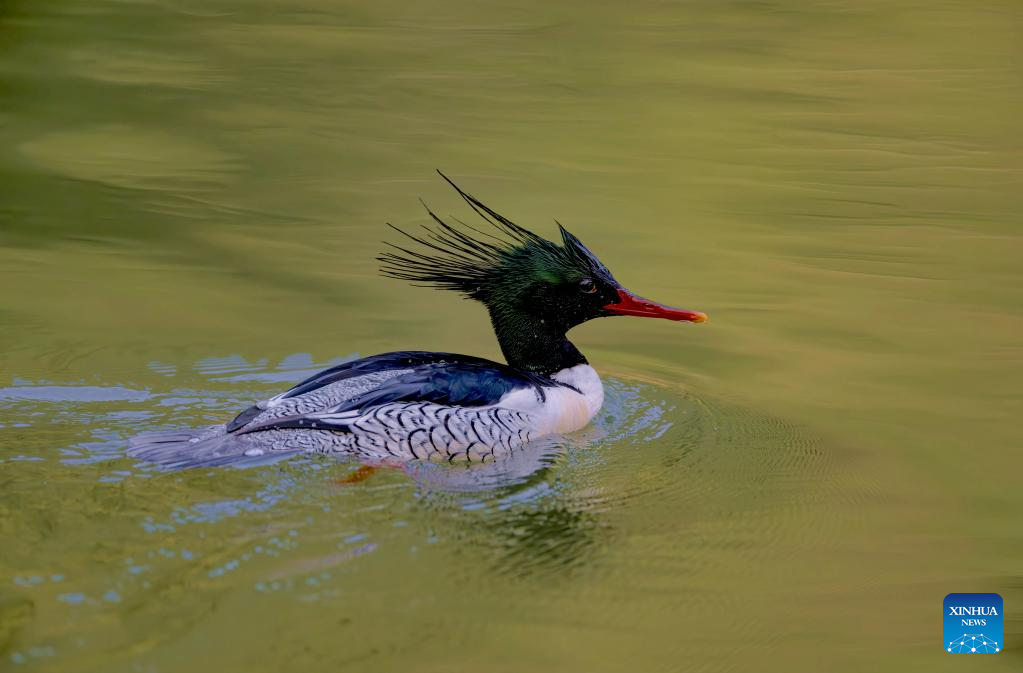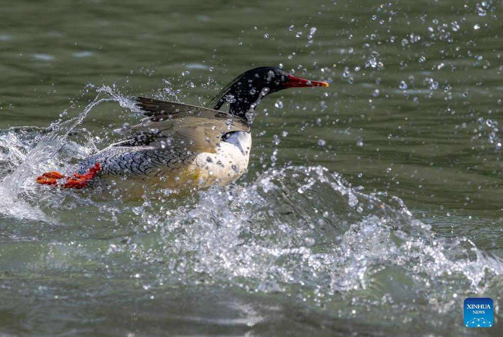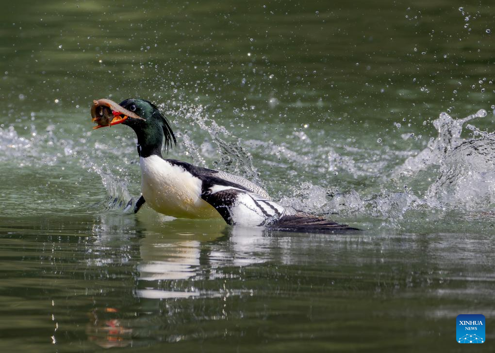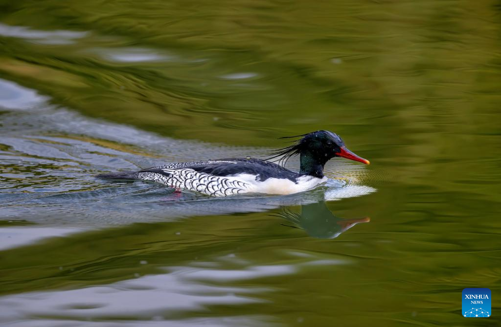 A Chinese Merganser forages on Dazhang River in Yongtai, southeast China's Fujian Province, Dec. 6, 2024. The Chinese merganser, nicknamed "living fossils with wings," is sporadically distributed in China and under first-grade state protection. It is also listed as endangered on the International Union for Conservation of Nature's Red List of Threatened Species. (Xinhua/Wei Peiquan)