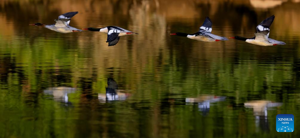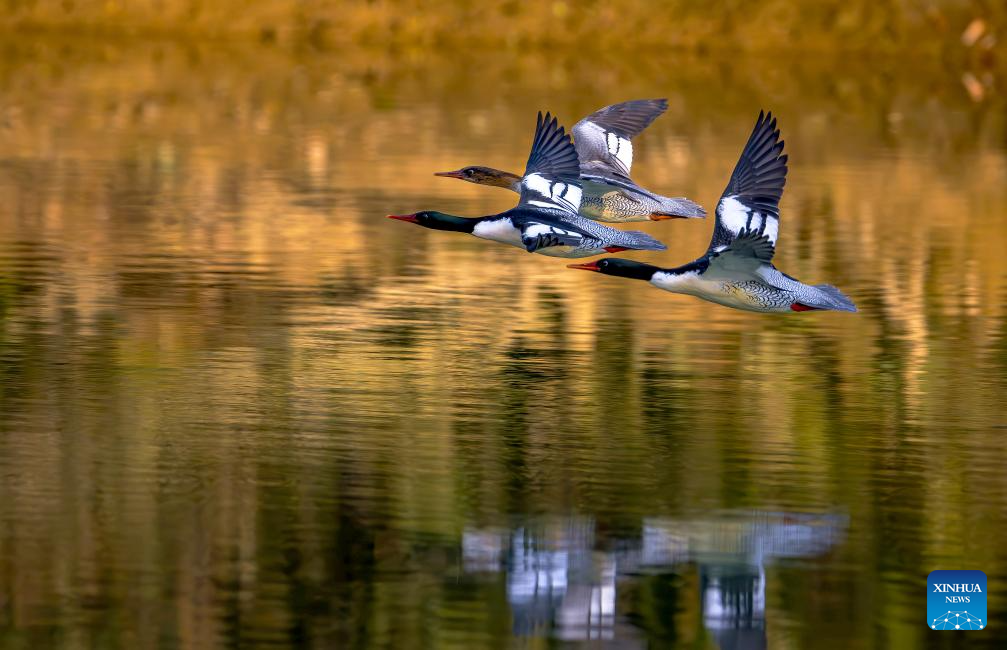 Chinese Mergansers fly over Dazhang River in Yongtai, southeast China's Fujian Province, Dec. 6, 2024. The Chinese merganser, nicknamed "living fossils with wings," is sporadically distributed in China and under first-grade state protection. It is also listed as endangered on the International Union for Conservation of Nature's Red List of Threatened Species. (Xinhua/Wei Peiquan)