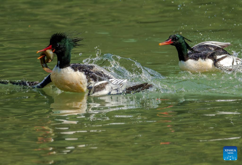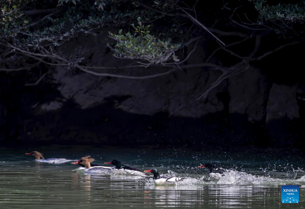Chinese Mergansers forage on Dazhang River in Yongtai, southeast China's Fujian Province, Dec. 6, 2024. The Chinese merganser, nicknamed "living fossils with wings," is sporadically distributed in China and under first-grade state protection. It is also listed as endangered on the International Union for Conservation of Nature's Red List of Threatened Species. (Xinhua/Wei Peiquan)