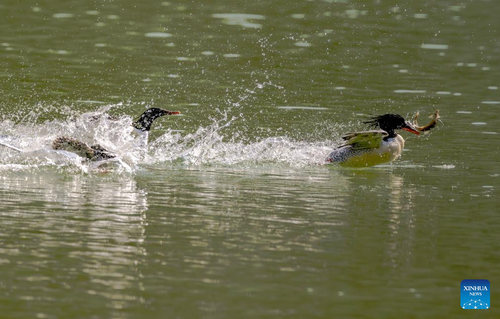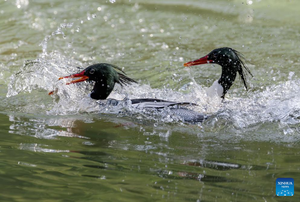 Chinese Mergansers fight while foraging on Dazhang River in Yongtai, southeast China's Fujian Province, Dec. 6, 2024. The Chinese merganser, nicknamed "living fossils with wings," is sporadically distributed in China and under first-grade state protection. It is also listed as endangered on the International Union for Conservation of Nature's Red List of Threatened Species. (Xinhua/Wei Peiquan)