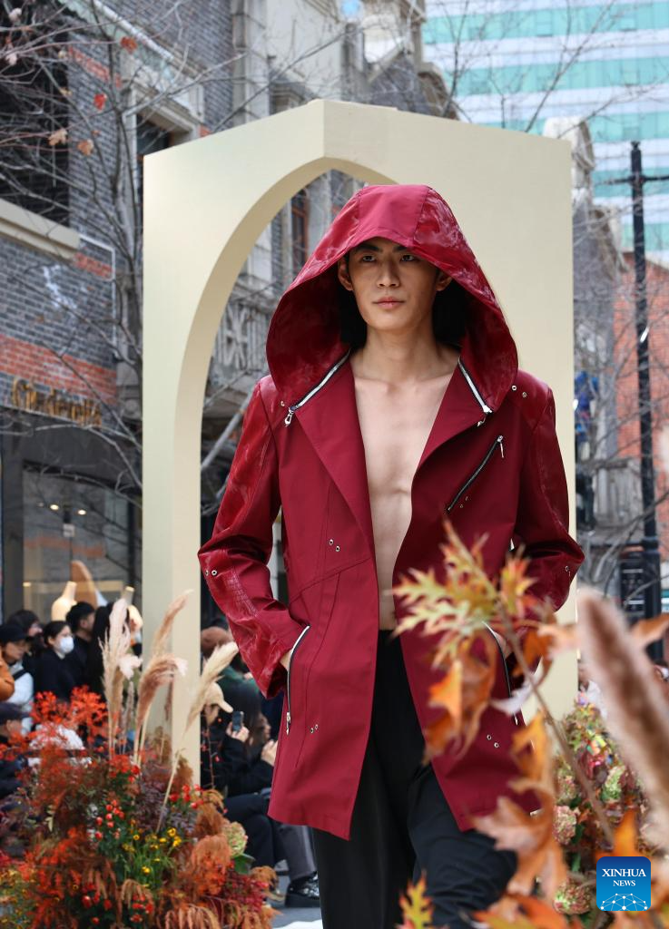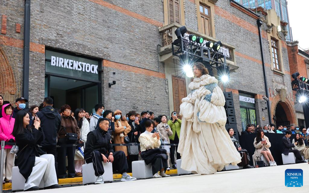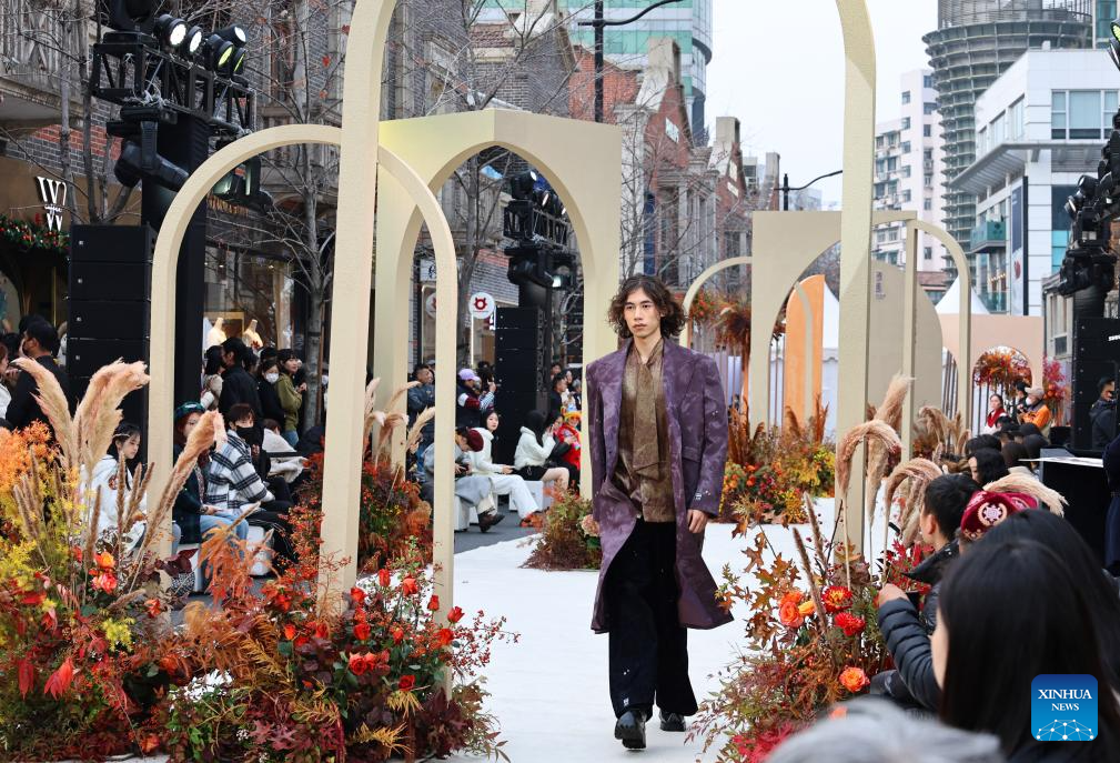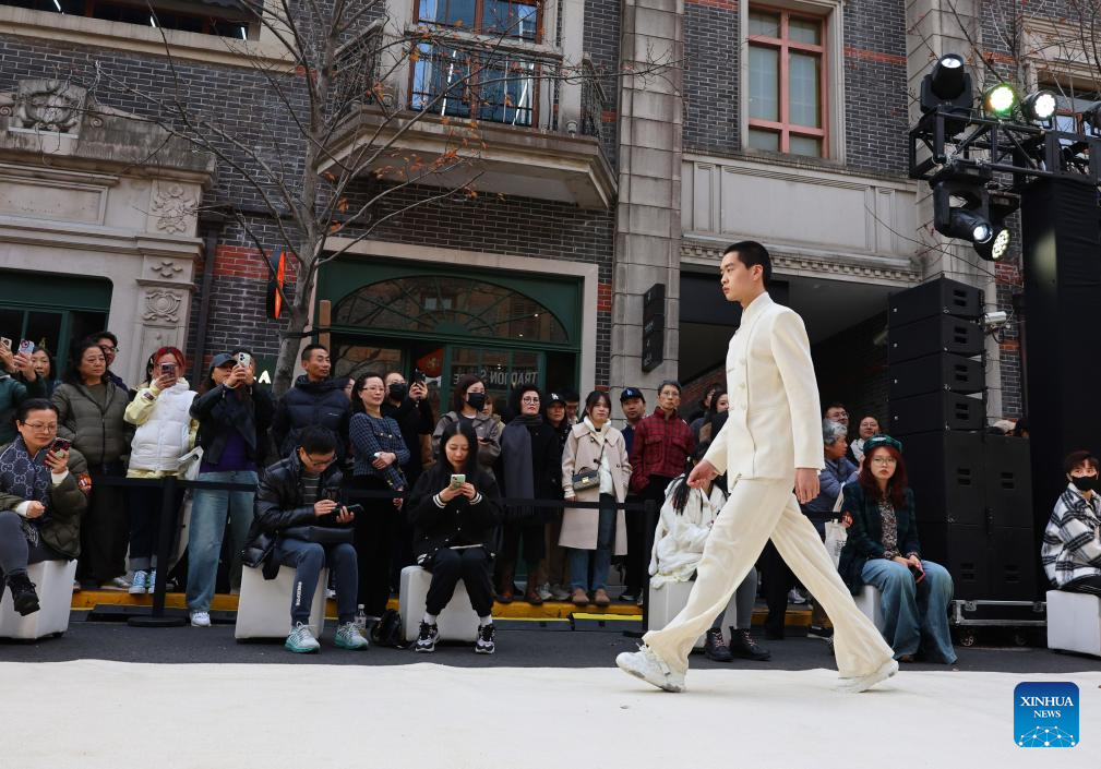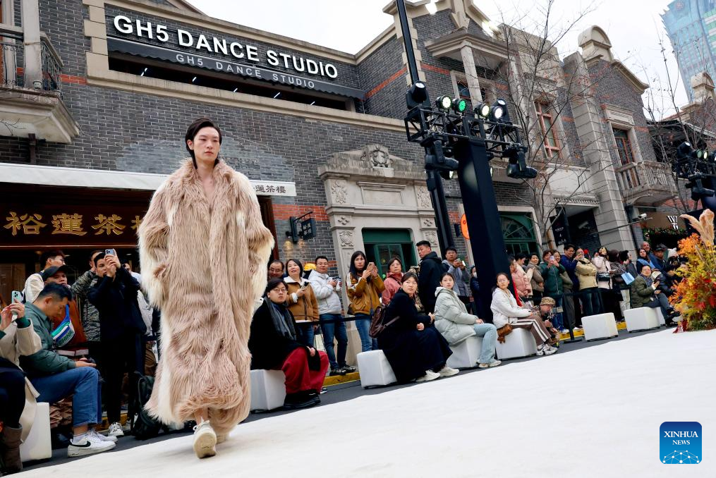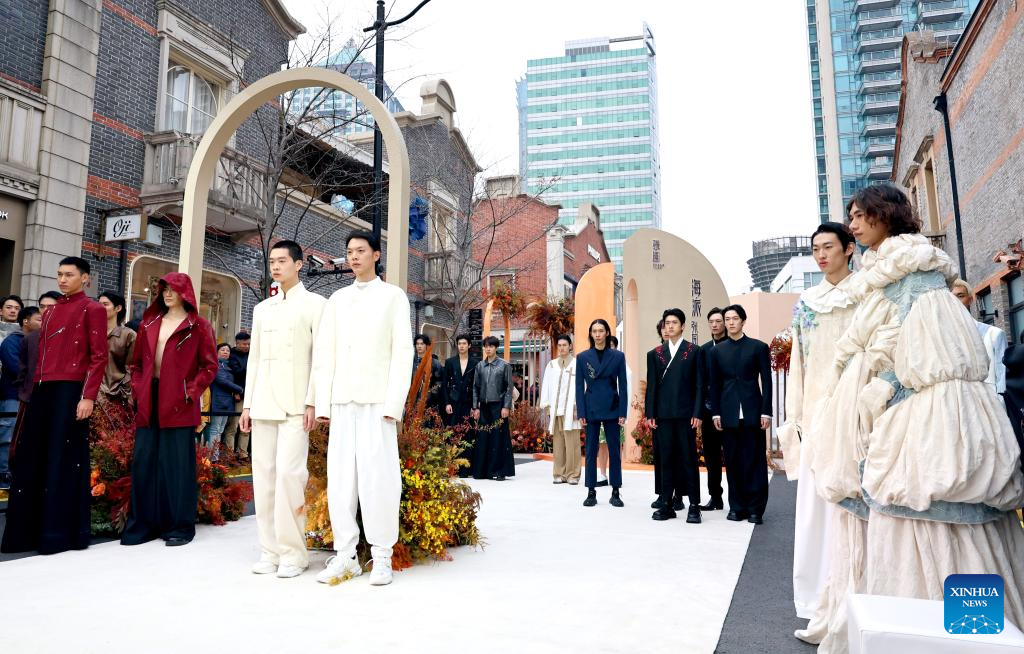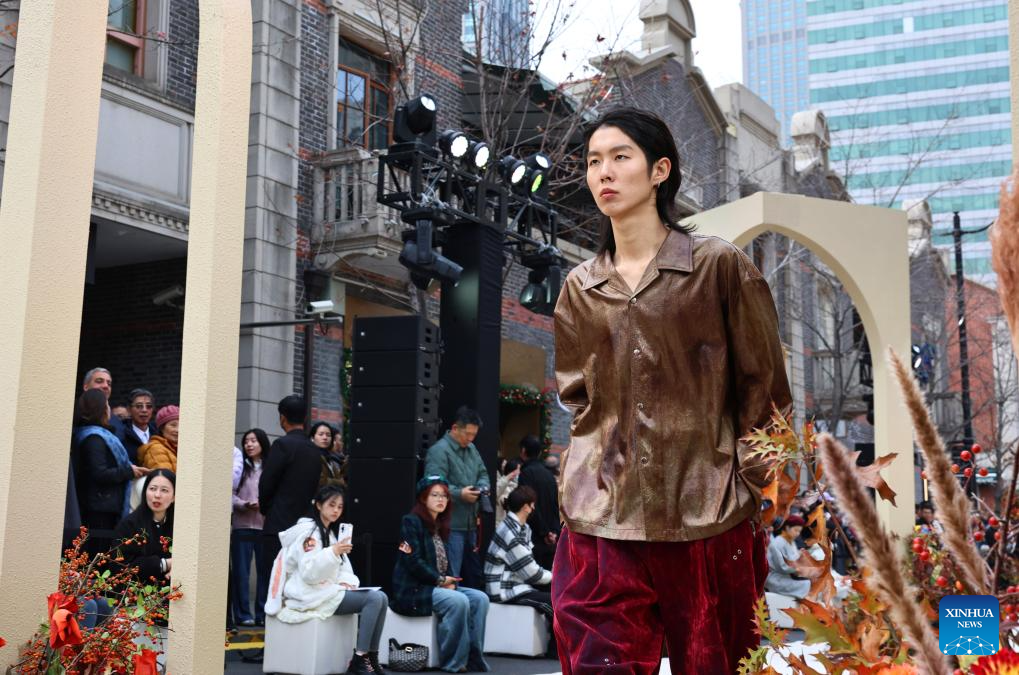 Models present creations during a fashion show held at Zhangyuan, or Zhang's Garden, in east China's Shanghai, Dec. 7, 2024. With the century-old Shikumen complex as the background and the Maoming North Road as the runway, a fashion show was held here on Saturday, bringing together the creations of many outstanding young designers in China. (Xinhua/Fang Zhe)