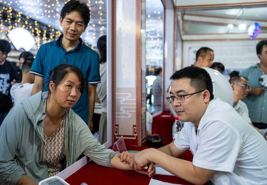 A medical worker (R) takes a citizen's pulse at a night traditional Chinese medicine clinic in Changning City, central China's Hunan Province, Aug. 13, 2024. (Xinhua/Chen Sihan)