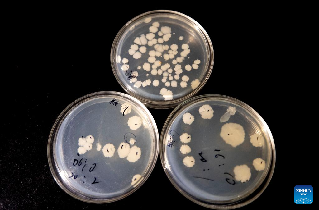 This photo taken on Dec. 6, 2024 shows microorganisms selected by the team of Yang Guoping to transform saline-alkali land at a laboratory in northwest China's Ningxia Hui Autonomous Region. In recent years, the team of Yang Guoping, a professor of North Minzu University, has been committed to the study of using microorganisms to transform saline-alkali land into arable land. (Xinhua/Yang Zhisen)