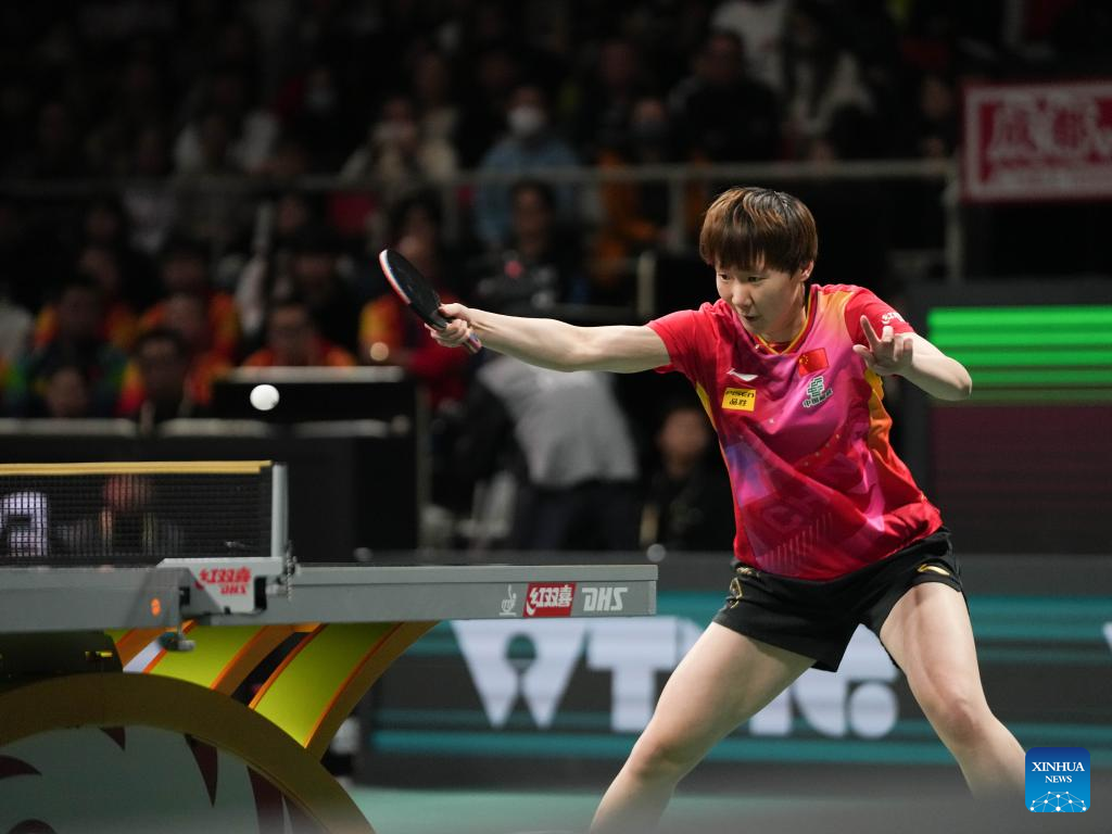 Wang Manyu of China competes during the women's singles match against Kim Nayeong of South Korea at the final match between China and South Korea at the ITTF Mixed Team World Cup 2024 in Chengdu, southwest China's Sichuan Province, Dec. 8, 2024. (Xinhua/Xu Bingjie)