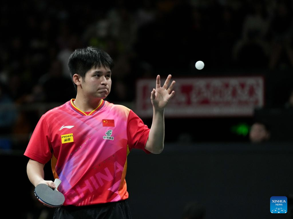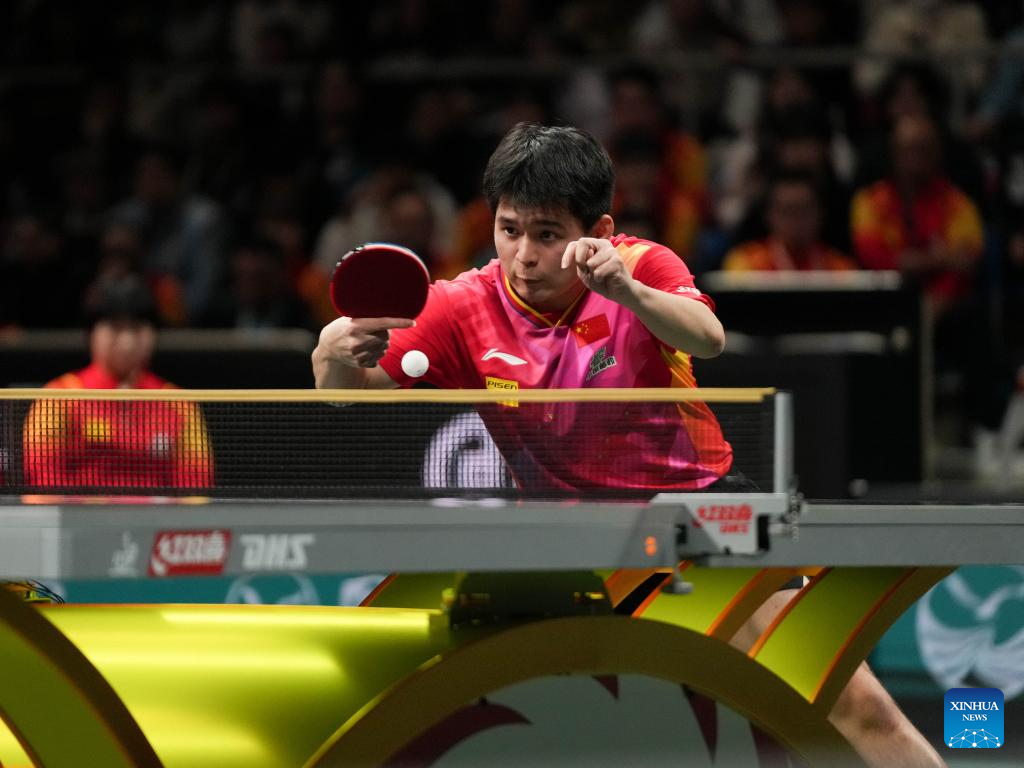 Lin Shidong of China competes during the men's singles match against Oh Junsung of South Korea at the final match between China and South Korea at the ITTF Mixed Team World Cup 2024 in Chengdu, southwest China's Sichuan Province, Dec. 8, 2024. (Xinhua/Xu Bingjie)