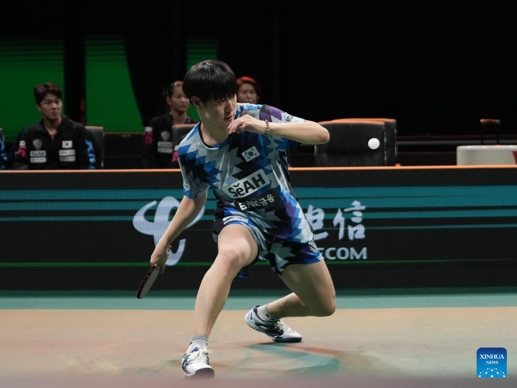 Oh Junsung of South Korea competes during the men's singles match against Lin Shidong of China at the final match between China and South Korea at the ITTF Mixed Team World Cup 2024 in Chengdu, southwest China's Sichuan Province, Dec. 8, 2024. (Xinhua/Xu Bingjie)