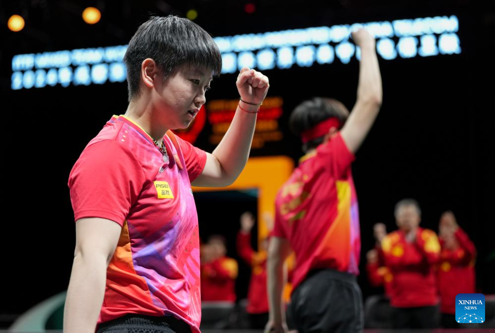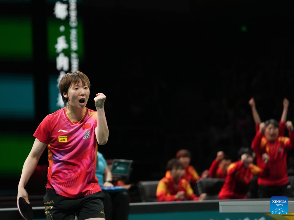 Wang Manyu of China celebrates during the women's singles match against Kim Nayeong of South Korea at the final match between China and South Korea at the ITTF Mixed Team World Cup 2024 in Chengdu, southwest China's Sichuan Province, Dec. 8, 2024. (Xinhua/Xu Bingjie)