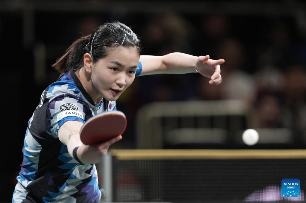Kim Nayeong of South Korea competes during the women's singles match against Wang Manyu of China at the final match between China and South Korea at the ITTF Mixed Team World Cup 2024 in Chengdu, southwest China's Sichuan Province, Dec. 8, 2024. (Xinhua/Jiang Hongjing)