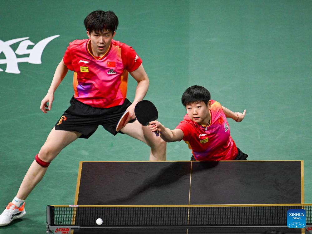 Wang Chuqin/Sun Yingsha (R) of China compete during the mixed doubles match against Cho Daeseong/Shin Yubin of South Korea at the final match between China and South Korea at the ITTF Mixed Team World Cup 2024 in Chengdu, southwest China's Sichuan Province, Dec. 8, 2024. (Xinhua/Wang Xi)
