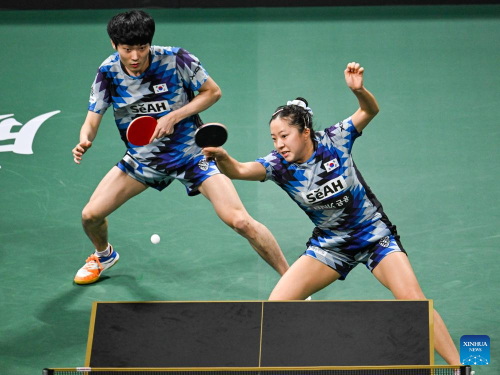 Cho Daeseong/Shin Yubin(R) of South Korea compete during the mixed doubles match against Wang Chuqin/Sun Yingsha of China at the final match between China and South Korea at the ITTF Mixed Team World Cup 2024 in Chengdu, southwest China's Sichuan Province, Dec. 8, 2024. (Xinhua/Wang Xi)