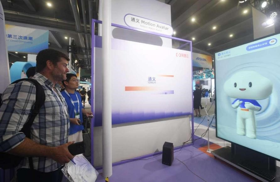 A visitor interacts with digital AI virtual character Yun Xiao Bao developed by Alibaba Cloud, the cloud computing arm of China's internet giant Alibaba, at the APSARA Conference 2024 in Hangzhou, east China's Zhejiang province, September 19, 2024. (People's Daily Online/Long Wei)