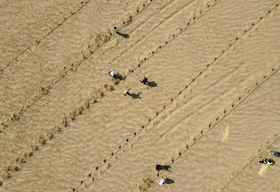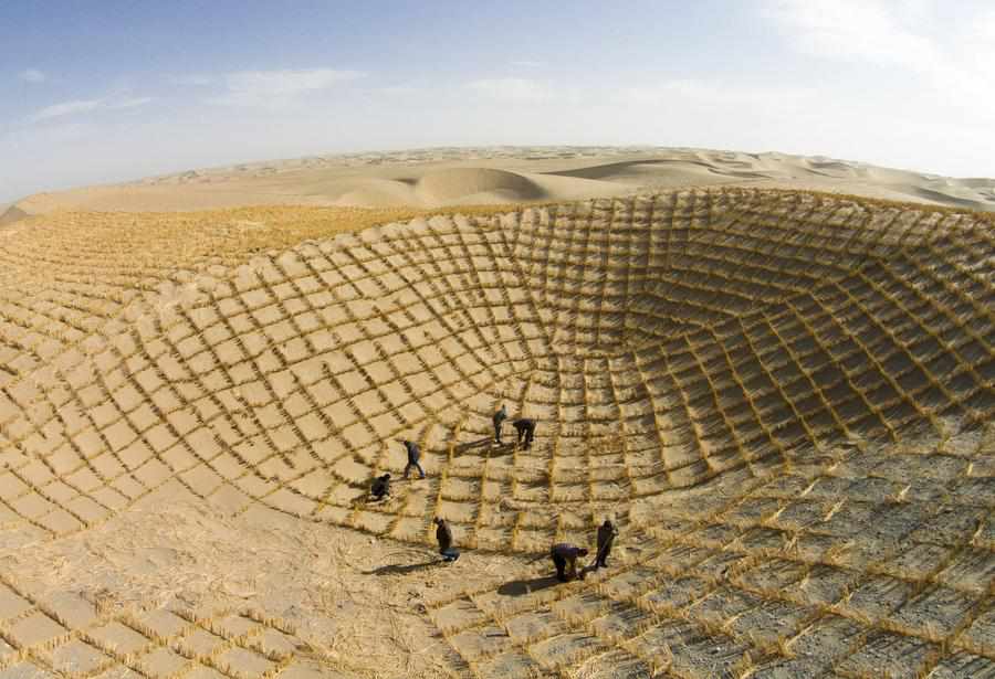 People fix straw checkerboards on sandy land in Qiemo County, northwest China's Xinjiang Uygur Autonomous Region, Oct. 6, 2014. (Xinhua/Jiang Wenyao)