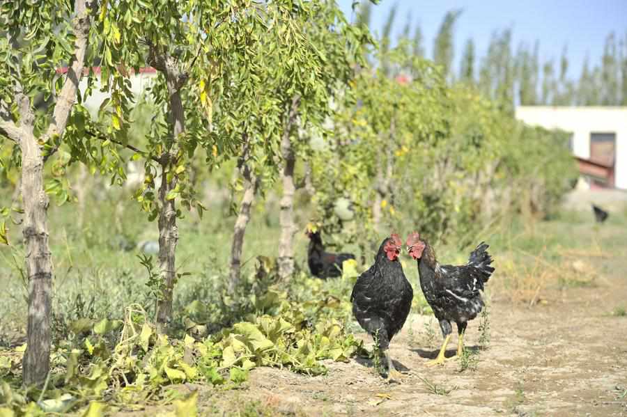 This photo shows a view of a fruit planting demonstration base in Qiemo County, northwest China's Xinjiang Uygur Autonomous Region, Sept. 19, 2017. (Xinhua/Hu Huhu)