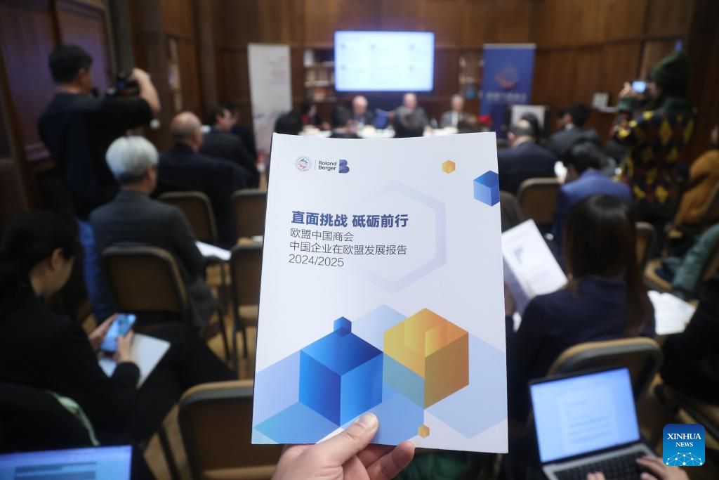 This photo taken on Dec. 9, 2024 shows a copy of the Chinese version of a report released by China Chamber of Commerce to the EU (CCCEU) and global consultancy Roland Berger in Brussels, Belgium. (Xinhua/Zhao Dingzhe)