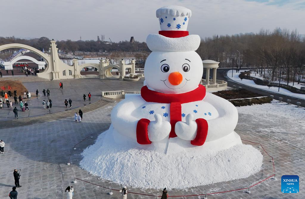 An aerial drone photo taken on Dec. 9, 2024 shows a giant snowman at the entrance square of the Sun Island scenic spot in Harbin, capital of northeast China's Heilongjiang Province.