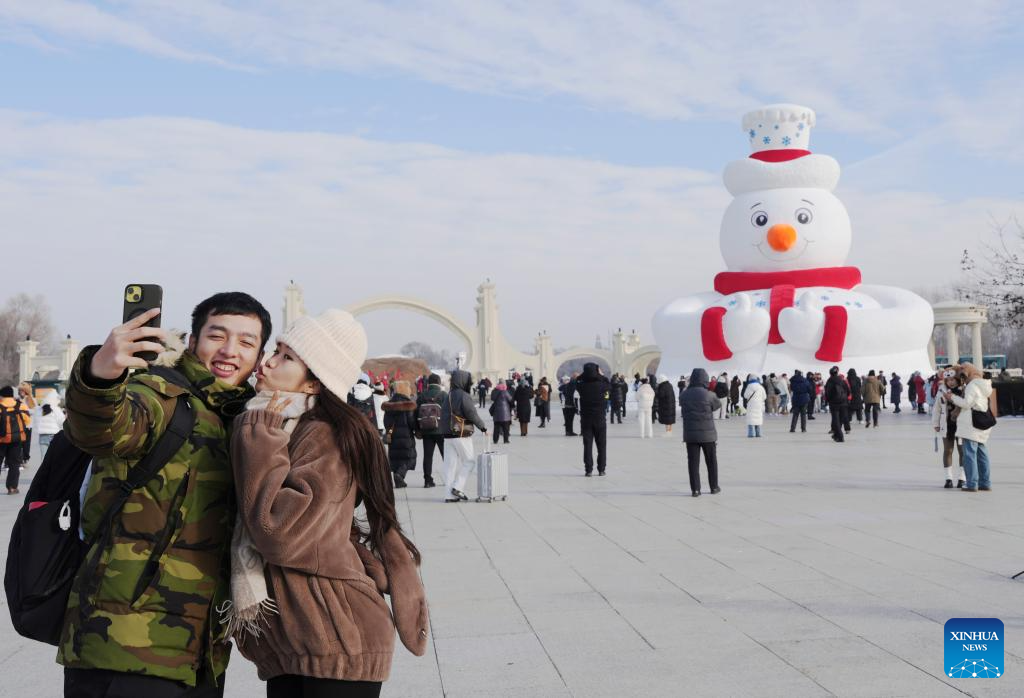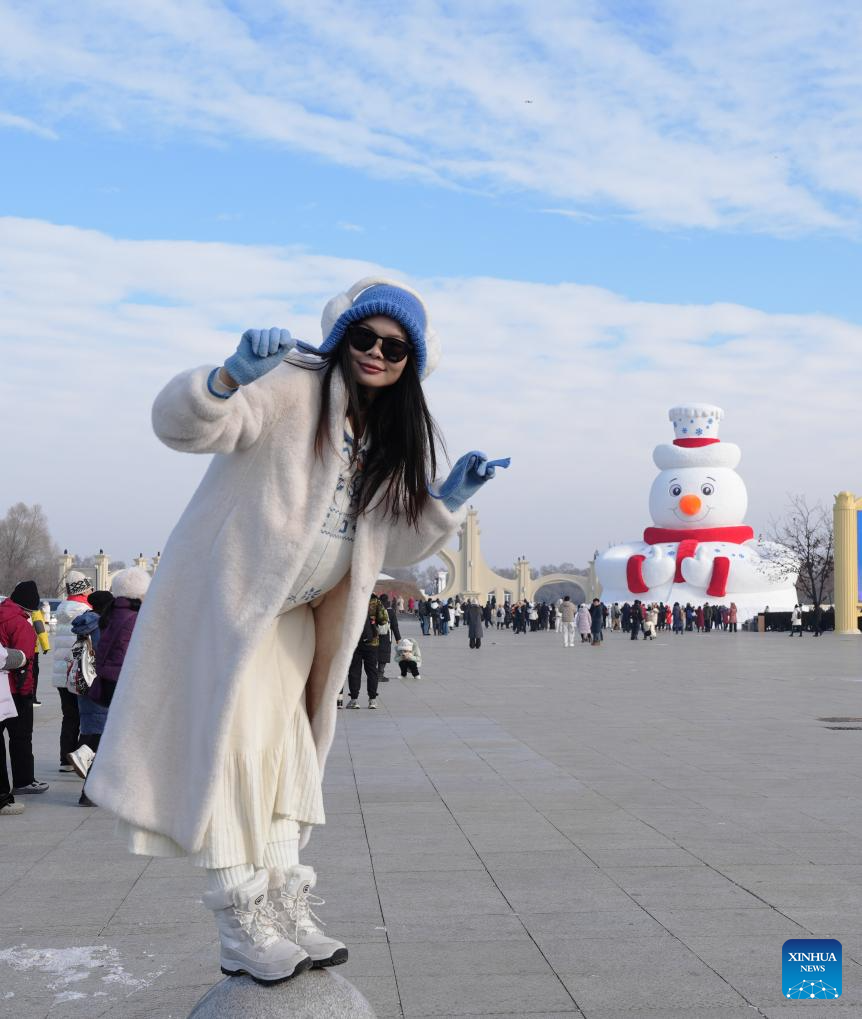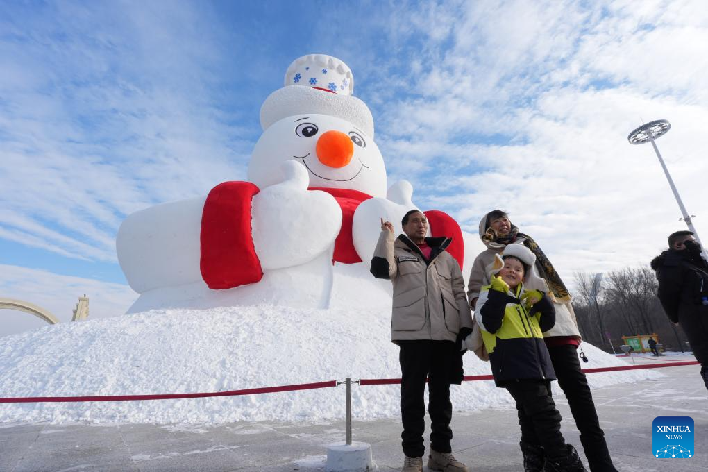 Visitors pose for photos with a giant snowman at the entrance square of the Sun Island scenic spot in Harbin, capital of northeast China's Heilongjiang Province, Dec. 9, 2024.