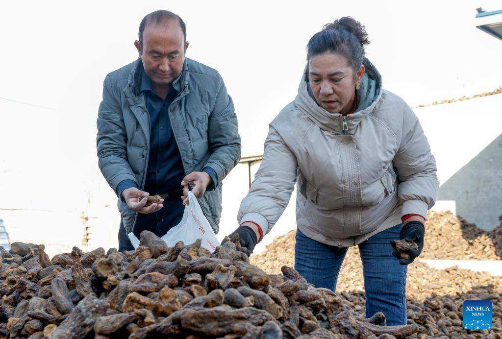 Memet Metseyit and his wife pick dried cistanche for sale in Pupuk Village of Minfeng County, northwest China's Xinjiang Uygur Autonomous Region, Dec. 4, 2024. (Xinhua/Wang Fei)