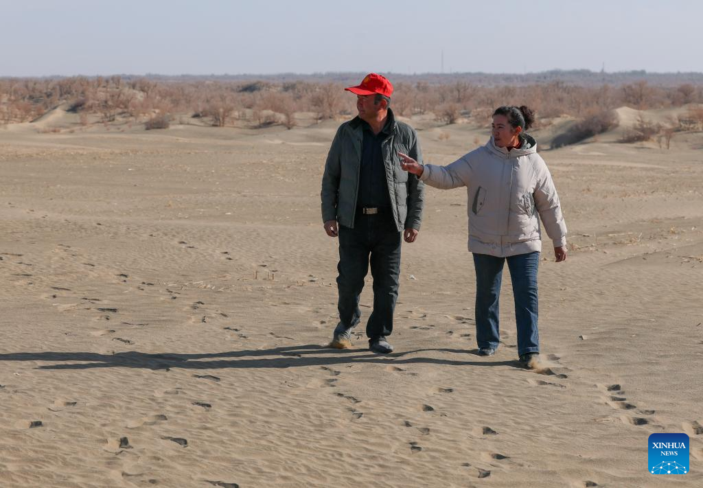 Memet Metseyit and his wife inspect the sandy land they contracted in Minfeng County, northwest China's Xinjiang Uygur Autonomous Region, Dec. 4, 2024. (Xinhua/Wang Fei)