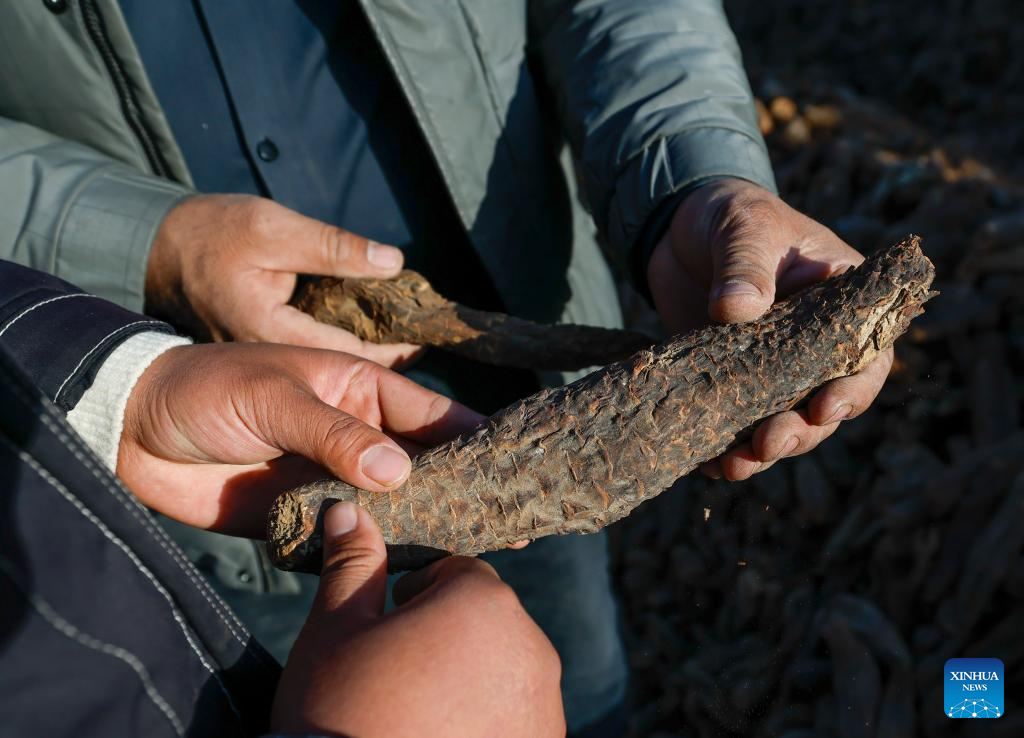Memet Metseyit arranges dried cistanche in Pupuk Village of Minfeng County, northwest China's Xinjiang Uygur Autonomous Region, Dec. 4, 2024. (Xinhua/Wang Fei)