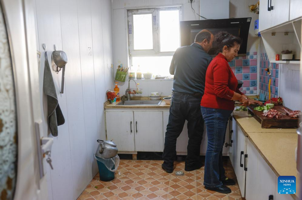 Memet Metseyit and his wife prepare lunch in Pupuk Village of Minfeng County, northwest China's Xinjiang Uygur Autonomous Region, Dec. 4, 2024. (Xinhua/Wang Fei)