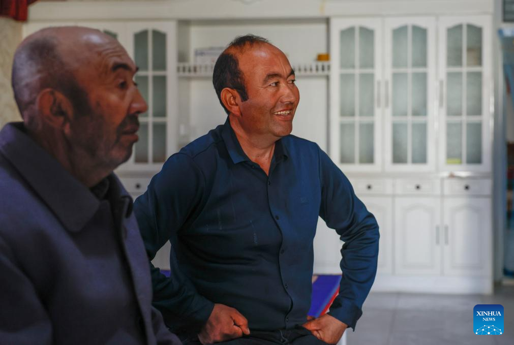 Memet Metseyit (R) talks with his family member at home in Pupuk Village of Minfeng County, northwest China's Xinjiang Uygur Autonomous Region, Dec. 4, 2024. (Xinhua/Wang Fei)