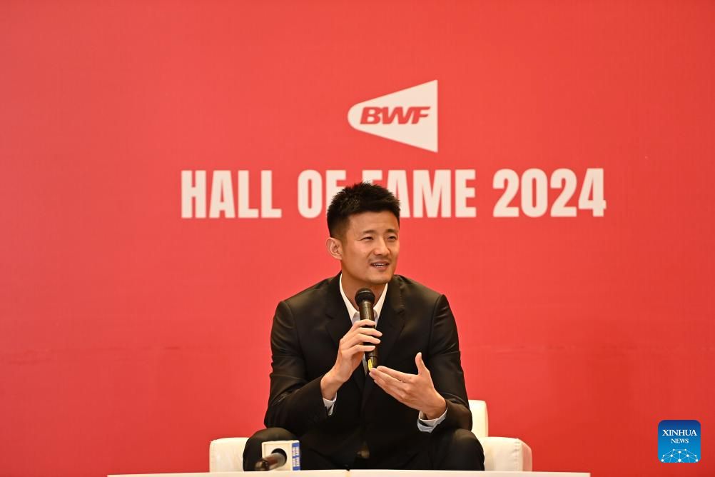 Chen Long of China answers questions of the media after being inducted to Badminton World Federation (BWF) Hall of Fame 2024 during a press conference in Hangzhou, east China's Zhejiang Province, Dec. 9, 2024. (Xinhua)