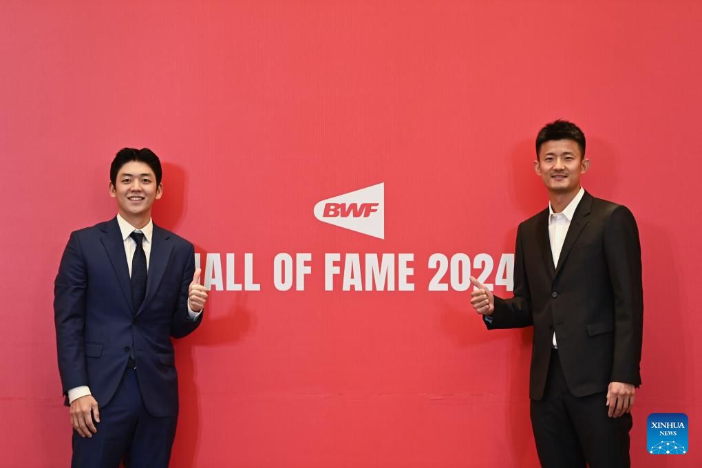 Chen Long (R) of China and Lee Yong Dae of South Korea pose for photos after being inducted to Badminton World Federation (BWF) Hall of Fame 2024 during a press conference in Hangzhou, east China's Zhejiang Province, Dec. 9, 2024. (Xinhua)