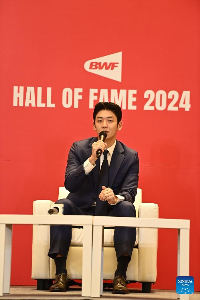 Lee Yong Dae of South Korea answers questions of the media after being inducted to Badminton World Federation (BWF) Hall of Fame 2024 during a press conference in Hangzhou, east China's Zhejiang Province, Dec. 9, 2024. (Xinhua)