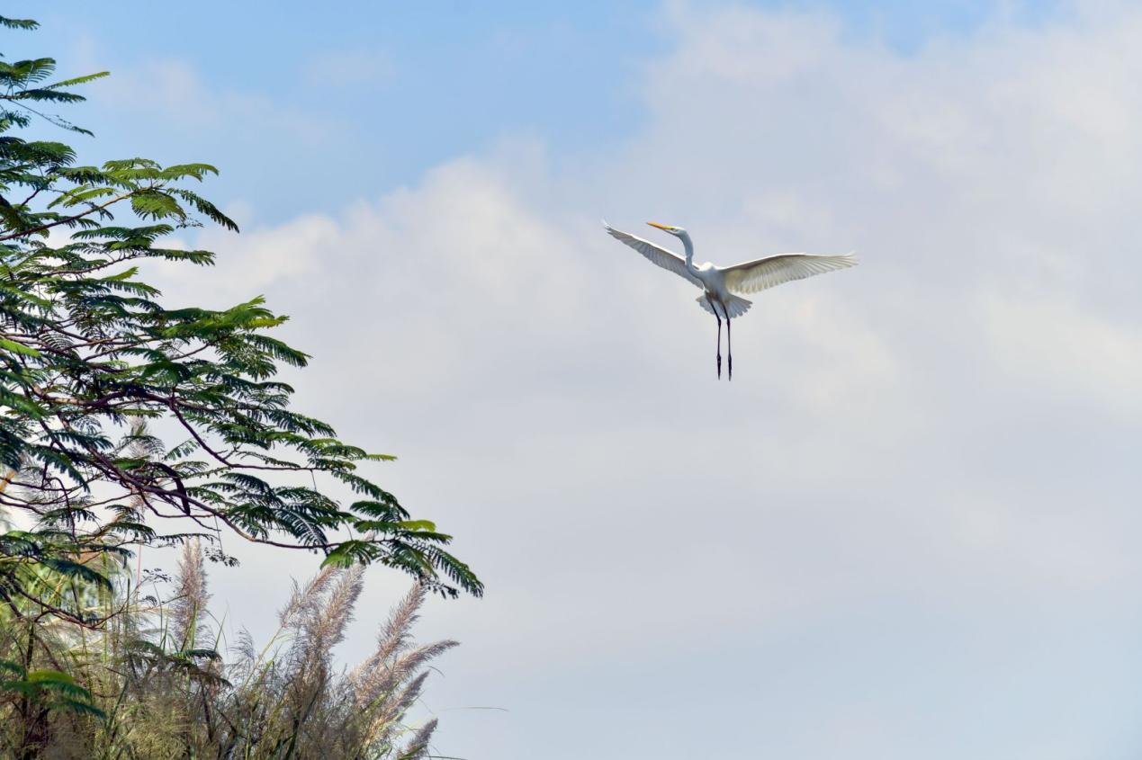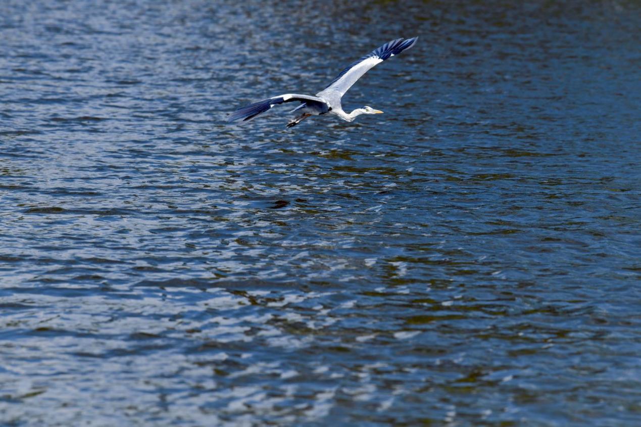 A bird flies over the lake at the OCT Wetland in Shenzhen, south China's Guangdong Province on Dec. 4, 2024. (People's Daily Online/Ren Fengtao)