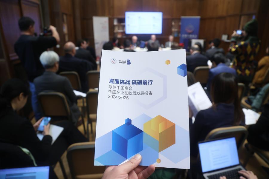 This photo taken on Dec. 9, 2024 shows a copy of the Chinese version of a report released by China Chamber of Commerce to the EU (CCCEU) and global consultancy Roland Berger in Brussels, Belgium. Chinese businesses in the EU have called for a fair, transparent and predictable market environment amid growing concerns over a deteriorating business climate in the bloc, according to a report released on Monday by the CCCEU and global consultancy Roland Berger. (Xinhua/Zhao Dingzhe)