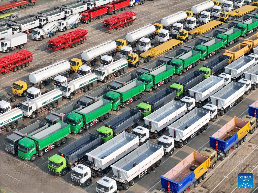 Trucks and engineering vehicles wait to be loaded at Yantai Port in east China's Shandong Province, Dec. 10, 2024. (Photo by Tang Ke/Xinhua)