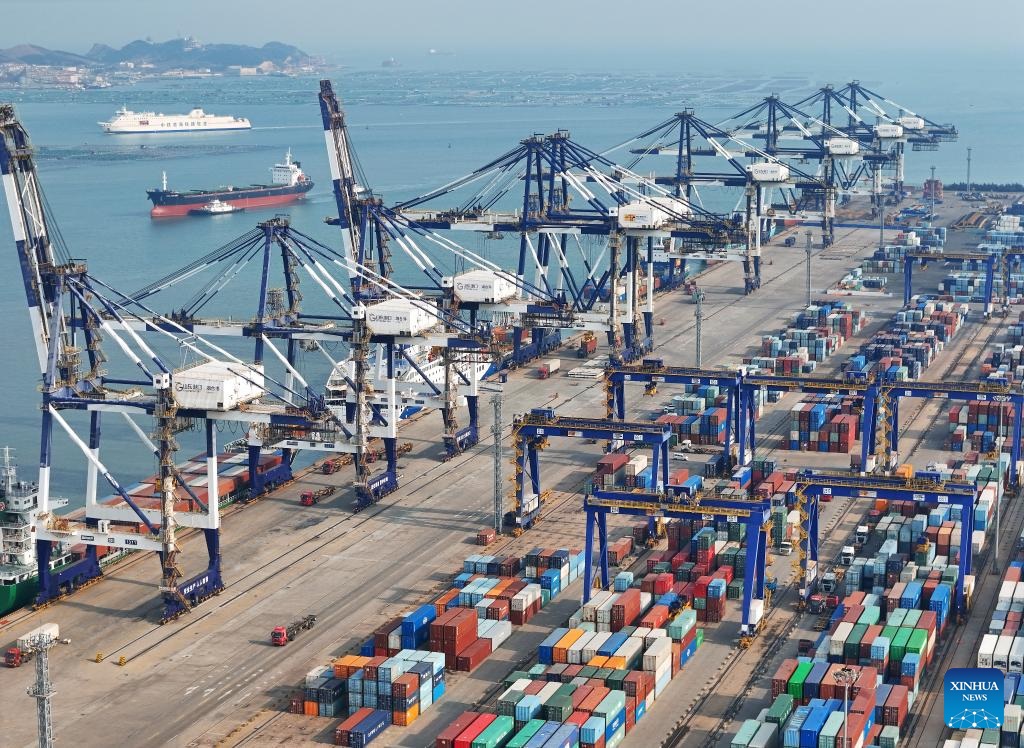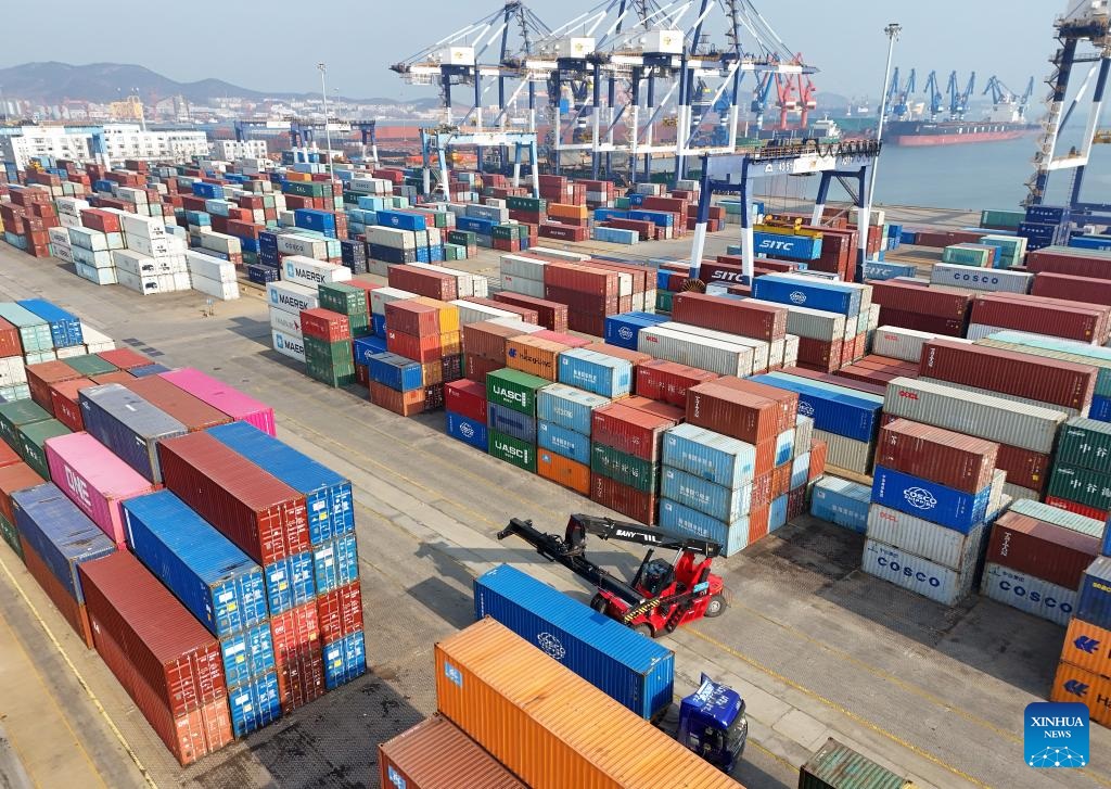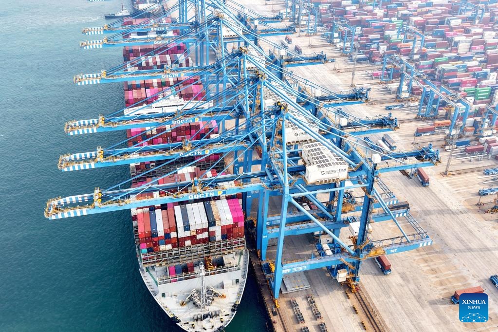 Containers are unloaded at Qingdao Port, east China's Shandong Province, Dec. 10, 2024. (Photo by Yu Fangping/Xinhua)