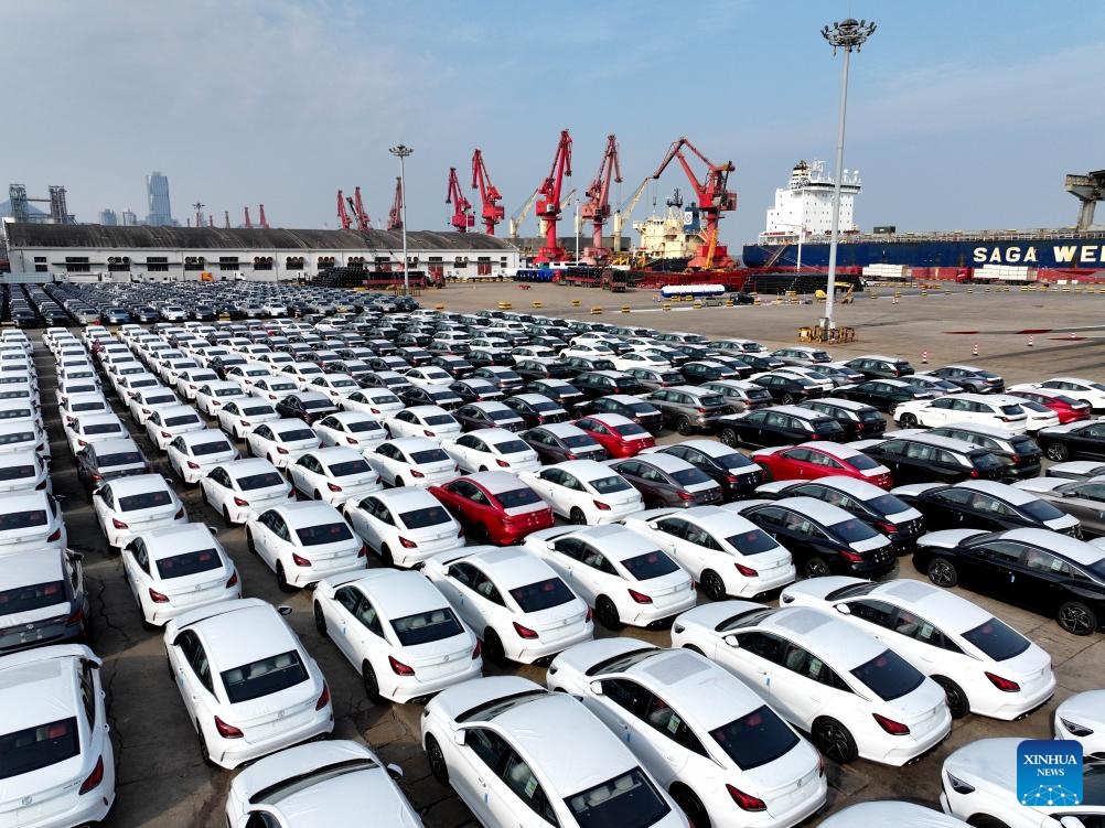 This aerial drone photo taken on Dec. 10, 2024 shows vehicles to be loaded for export at Lianyungang Port, east China's Jiangsu Province. (Photo by Wang Chun/Xinhua)