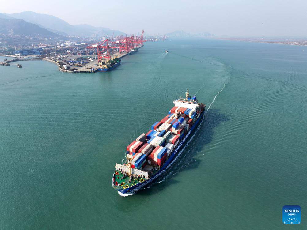 This aerial drone photo taken on Dec. 10, 2024 shows a cargo ship loaded with containers leaving Lianyungang Port, east China's Jiangsu Province. (Photo by Wang Chun/Xinhua)