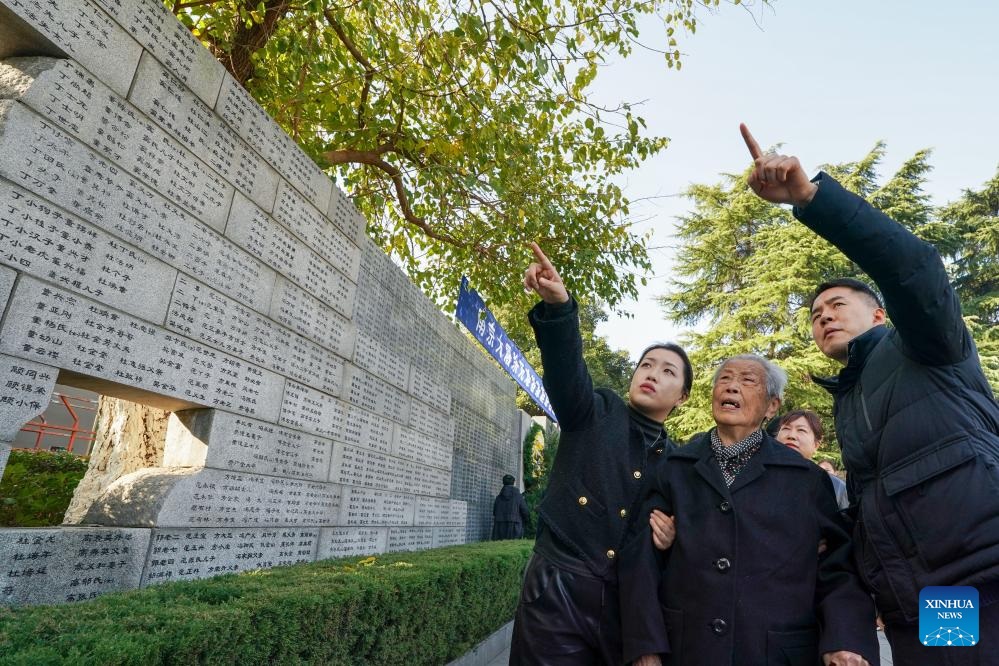 Ai Yiying (2nd R), a Nanjing Massacre survivor, searches for the names of her relatives, the victims of the Nanjing Massacre, in front of the "wailing wall" outside the Memorial Hall of the Victims in Nanjing Massacre by Japanese Invaders, in Nanjing, east China's Jiangsu Province, Dec. 1, 2024. (Xinhua/Li Bo)