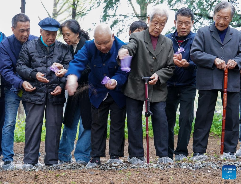 This photo taken on April 3, 2024 shows Ai Yiying (3rd R, front), a Nanjing Massacre survivor, participating in commemoration activities at the Memorial Hall of the Victims in Nanjing Massacre by Japanese Invaders, in Nanjing, east China's Jiangsu Province, on the Qingming Festival, or the Tomb-Sweeping Day, a traditional Chinese festival during which people pay tribute to the dead and worship their ancestors.(Xinhua/Li Bo)