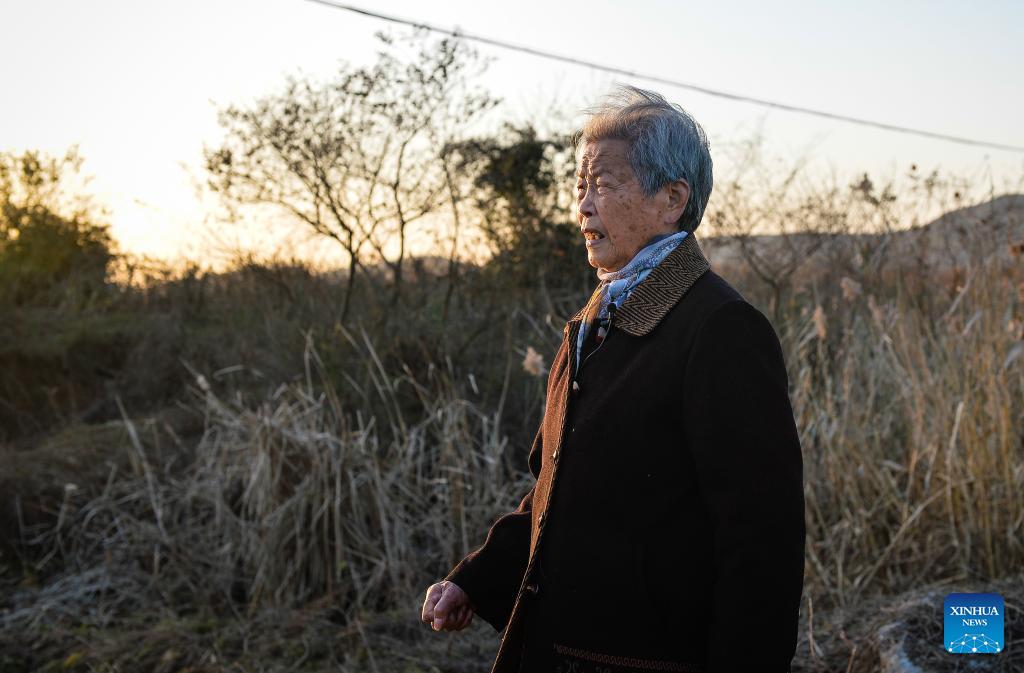 This file photo taken on Dec. 3, 2015 shows Ai Yiying, a Nanjing Massacre survivor, standing on the place where her relatives were killed by the Japanese invaders in Nanjing, east China's Jiangsu Province. (Xinhua/Ji Chunpeng)