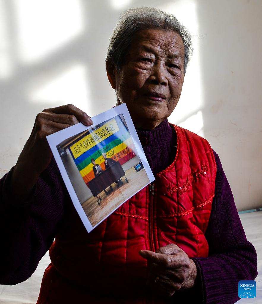 This file photo taken on Dec. 3, 2015 shows Ai Yiying, a Nanjing Massacre survivor, displaying a photo taken when she attended a testimony meeting in Japan in December 2014, at home in Nanjing, east China's Jiangsu Province. (Xinhua/Ji Chunpeng)