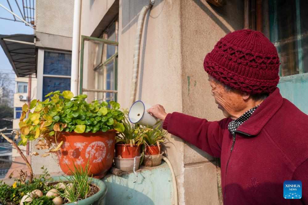 Ai Yiying, a Nanjing Massacre survivor, waters flowers at home in Nanjing, east China's Jiangsu Province, Dec. 7, 2024. (Xinhua/Li Bo)