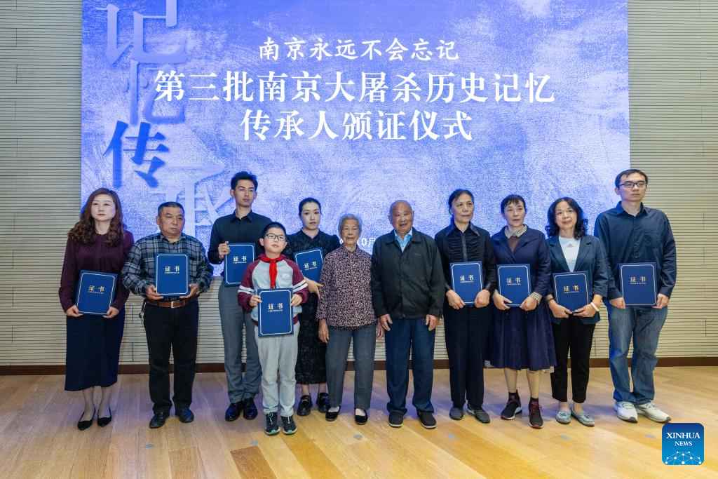 The inheritors of historical memories regarding the Nanjing Massacre pose for photos with the Nanjing Massacre survivors Ai Yiying (6th L) and Liu Minsheng (7th L) in Nanjing, east China's Jiangsu Province, Oct. 11, 2024. (Xinhua)