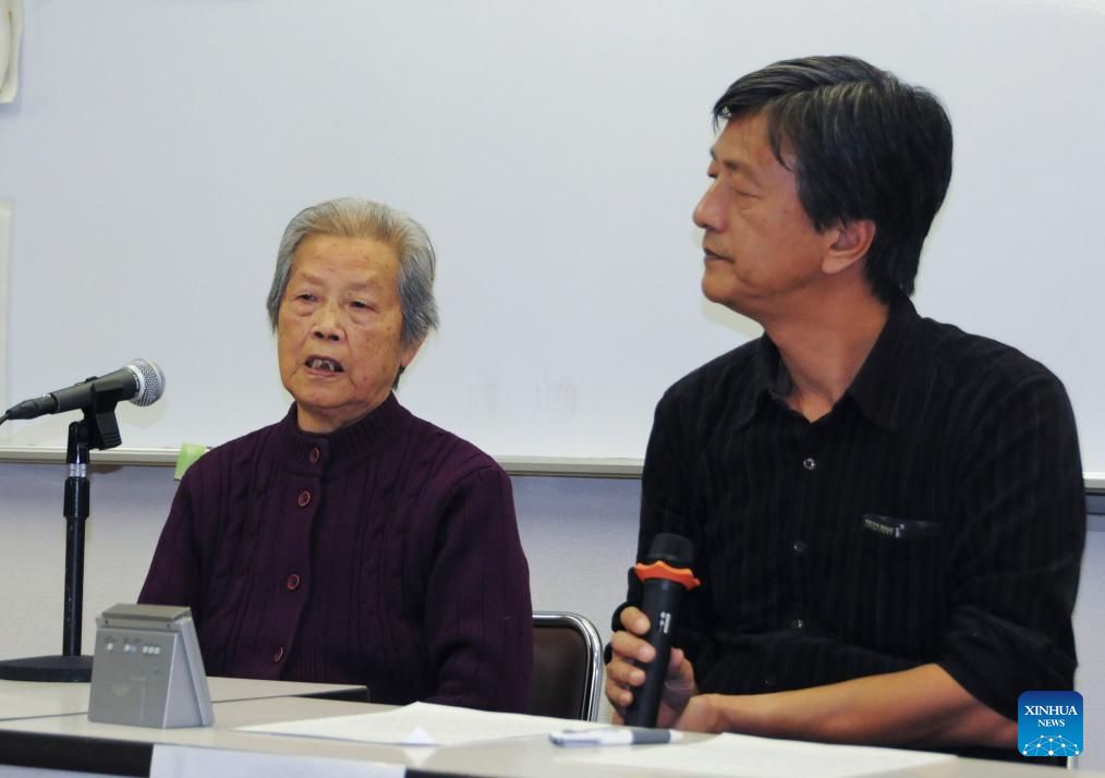 This file photo taken on Dec. 7, 2014 shows Ai Yiying, a Nanjing Massacre survivor, telling about personal experience in the Nanjing Massacre when she attends a testimony meeting held in Osaka, Japan. (Xinhua/Ma Xinghua)