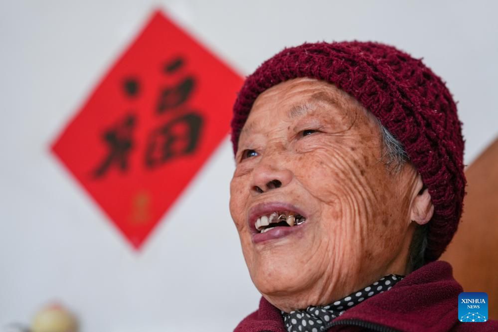 Ai Yiying, a Nanjing Massacre survivor, talks with her family at home in Nanjing, east China's Jiangsu Province, Dec. 7, 2024. (Xinhua/Li Bo)