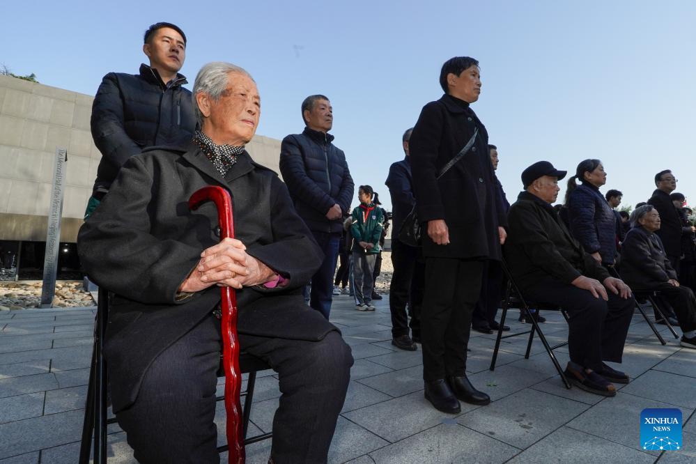 Ai Yiying (1st L), a Nanjing Massacre survivor, attends the family commemoration for victims of the Nanjing Massacre in Nanjing, east China's Jiangsu Province, Dec. 1, 2024. (Xinhua/Li Bo)