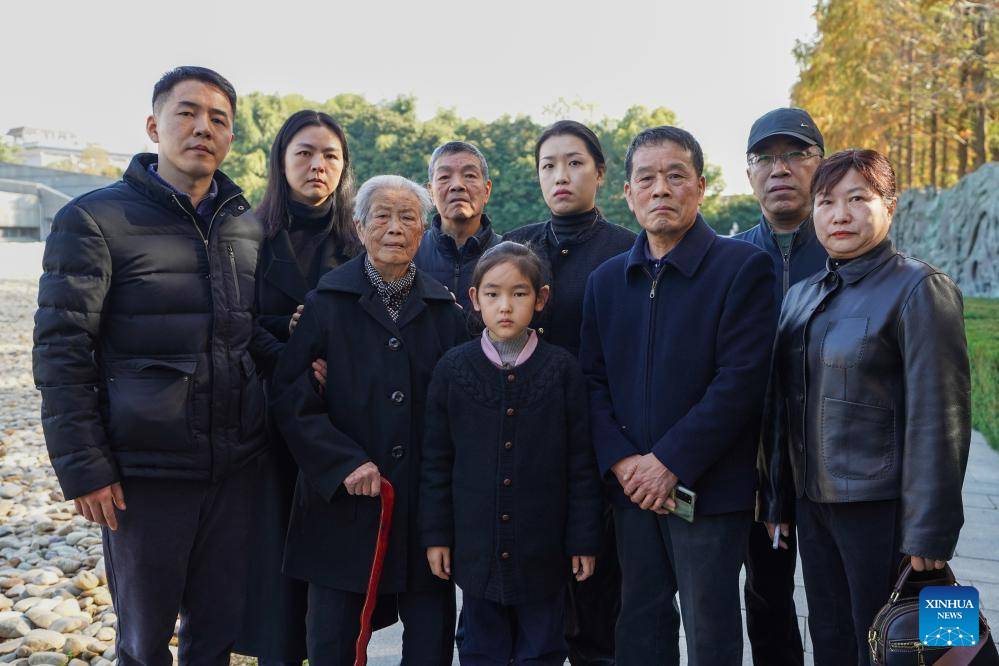 Ai Yiying (3rd L), a Nanjing Massacre survivor, attends the family commemoration for victims of the Nanjing Massacre in Nanjing, east China's Jiangsu Province, Dec. 1, 2024. (Xinhua/Li Bo)